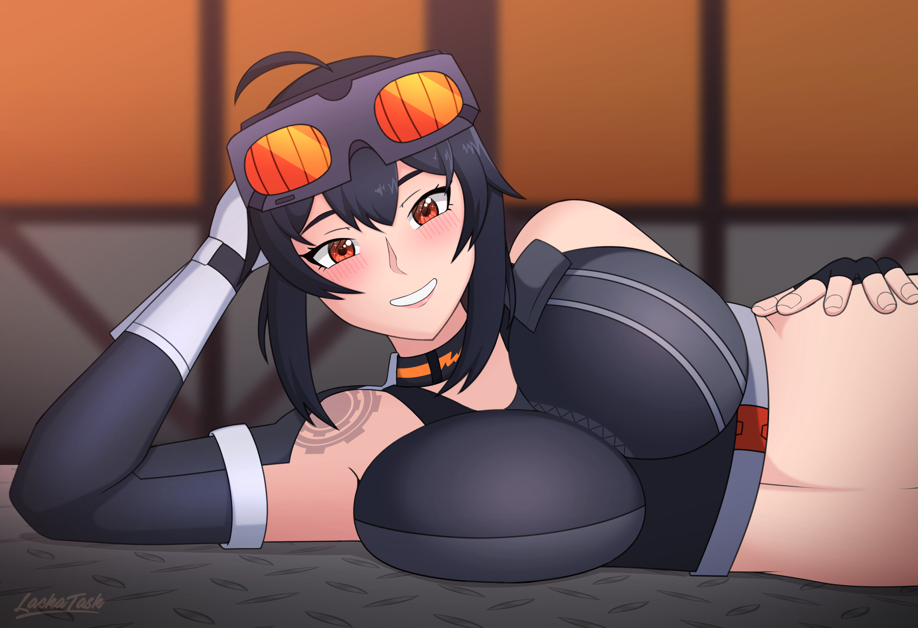 Tags: 1girlsarmwearbig breastsblack hairblushbreast focusbreastsdetached sleevesfemalefemale onlygogglesgoggles on headhairhand on headhand on waistheadwearhuge breastsmechanicneckwearon sideorange eyessmilesolosolo femaletank toptattootattoo on shouldertopwearupper bodyupper body focus