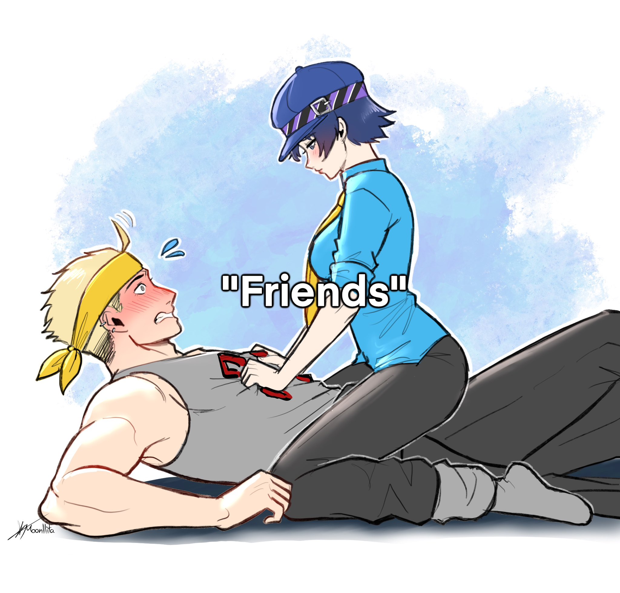 Tags: 1girlsbandanabig breastsblonde hairblonde haired maleblue eyesblue hairblushcowgirl positiondark blue hairembarrassedfemalehatin lovelooking at anotherlooking at partnerlooking downlooking pleasuredside viewsitting on anothersitting on penissitting on personslim waistsmaller femalesocksstraighttaller malethick thighstight clothingtight fittomboytomboyishwholesomewide hips