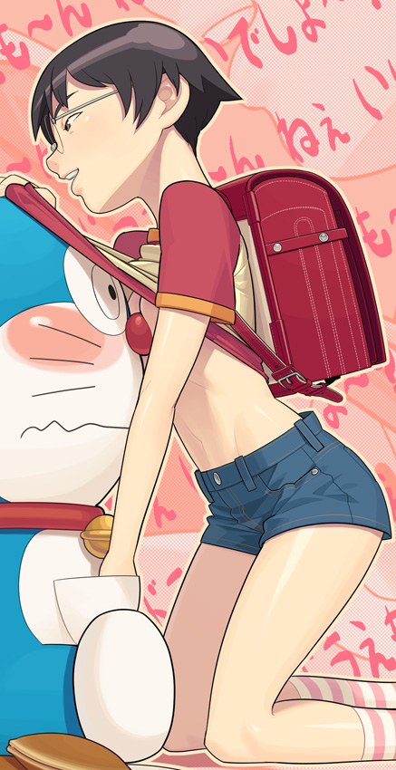 Tags: backpackbagbrown eyesbrown hairfemaleflat chestglassesplushieplushophiliaraglan sleevesrandoserushirt liftshort hairshorts