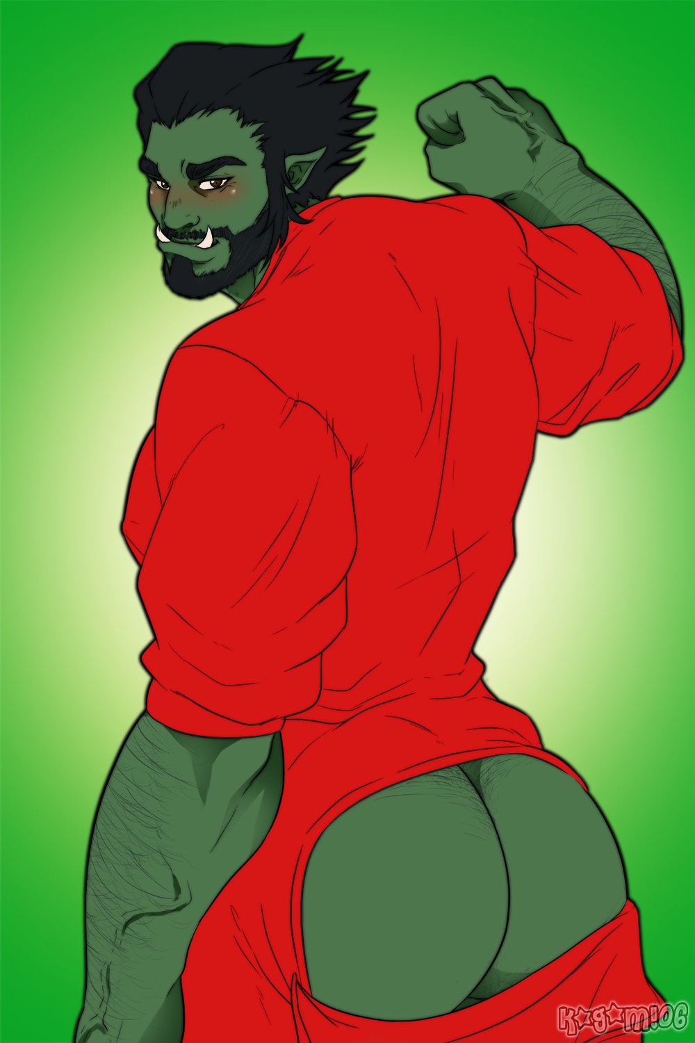 Tags: 1boyassass outbeardbeefyblack hairbody hairbrown eyesfacial hairgreen skinhairy armshumanoidimageboardkagami06malemale onlymasculinemuscular maleorcpointy earsRule34tusksunion suitveiny arms