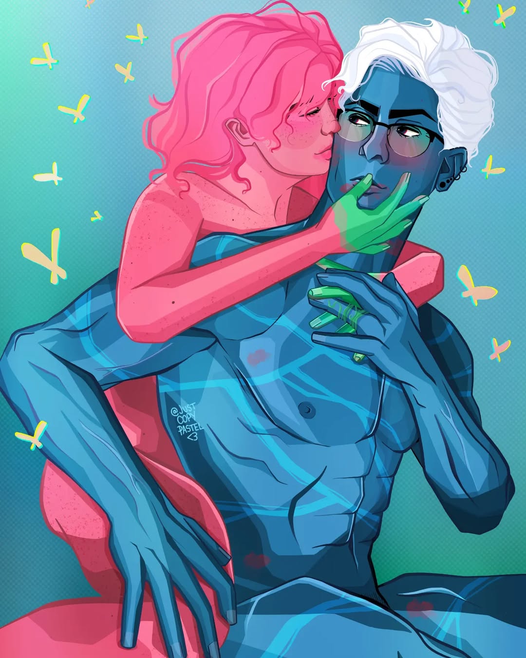 Tags: blue bodyblue skinglassesmarried couplemuscular malepink bodypink hairpink skinred eyesscarswhite hair