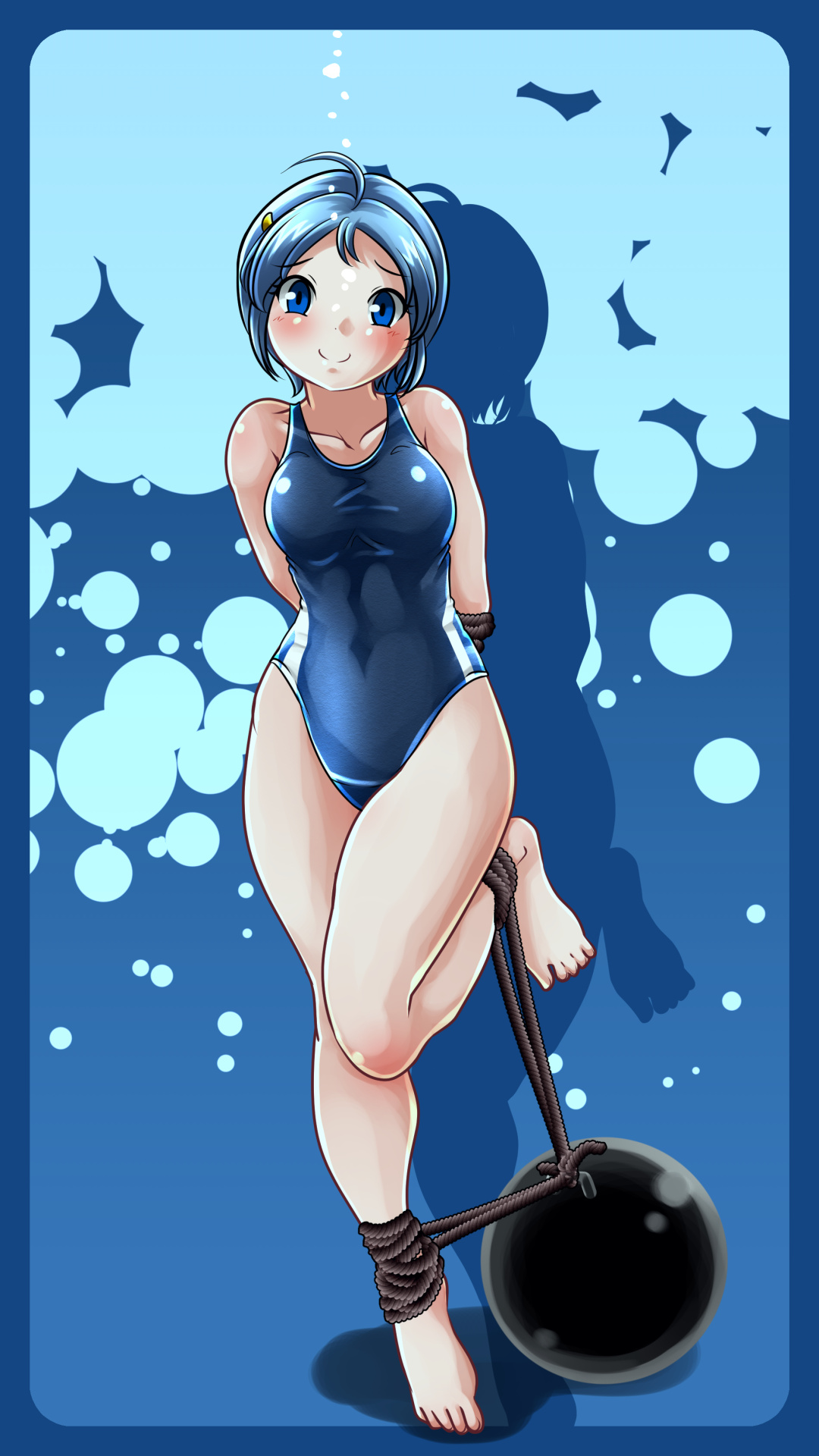 Tags: arms behind backarms bound behind backblue eyesblue hairblushboundbound armsbound wristsbreastscollarboneiron ballone-piece swimsuitropeschool swimsuitshort hairsmall breastsswimsuitunderwater