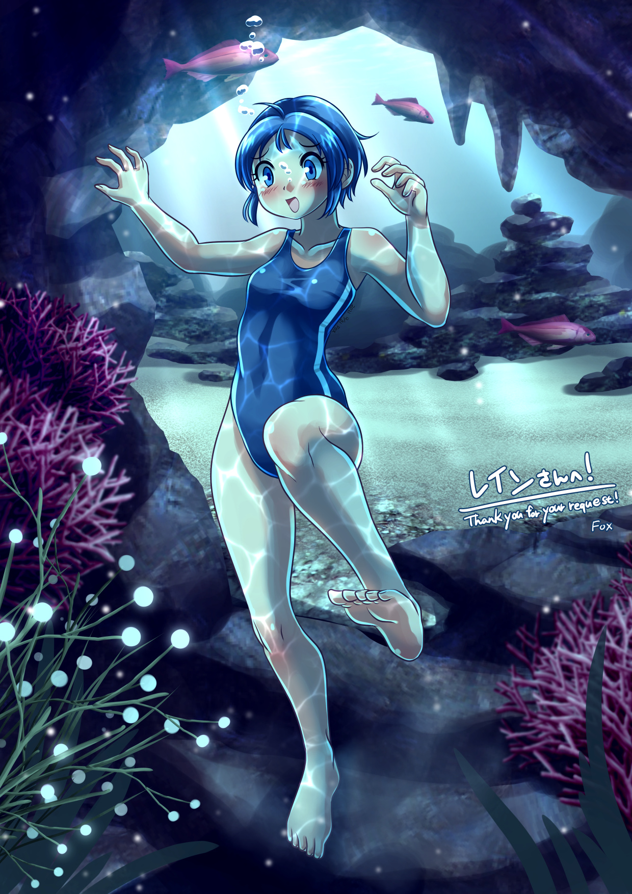 Tags: blue eyesblue hairblushbreastscavecollarbonecoralfeetfishone-piece swimsuitrocksschool swimsuitshort hairsmall breastsswimsuitunderwater