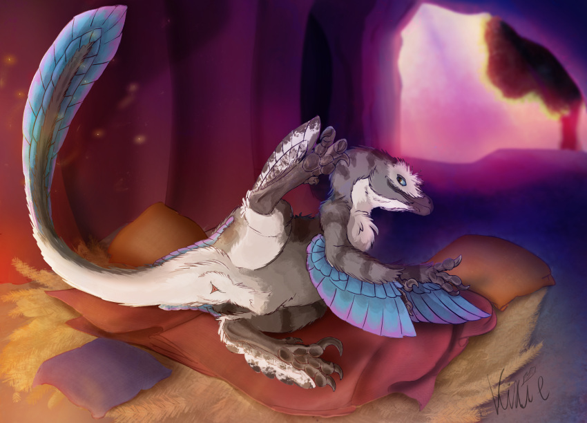 Tags: animal genitaliaavianbedbellyblue bodyblue feathersclawscloacacozydetailed backgrounddinosaurdromaeosauridfeathered wingsfeathersfemaleferalfurnituregenitalshi resimageboardinvitinglyingon sidepillowpresentingraised legraised tailreptileRule34scaliesolotheropodthyvixieutahraptorvix (vixie)warm colorswhite bellywings