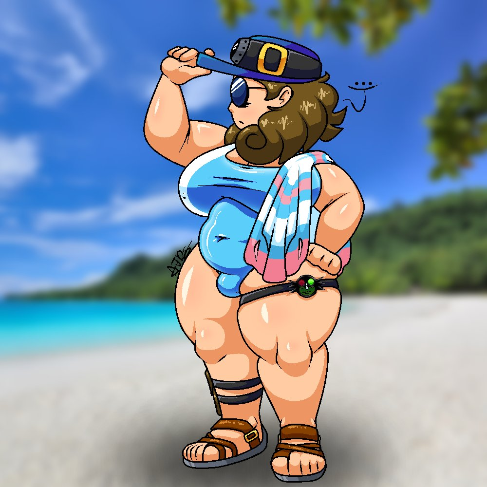 Tags: beachbeach towelbig breastsblue hatbrown hairbulgebulge through clothingeggman empireeggman logoglassesgoggles on foreheadhand on hipone-piece swimsuitRule34sandalsthick thighsthigh straptransgender pride colors