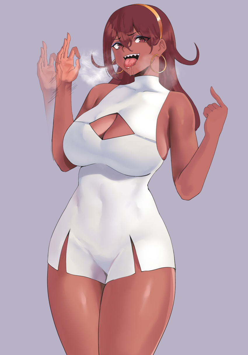 Tags: 1girlsbig breastsbrown eyesbrown haircleavage cutoutdark skindark-skinned femaleearringsfellatio gesturefemalefemale onlygrey backgroundhairbandhi resimageboardlegs togetherlong hairlooking at vieweropen mouthredrawRule34sharp teethsmilingsmiling at viewersolosteamy breaththick thighstongue outtsona (nyantcha)voluptuousyotahen