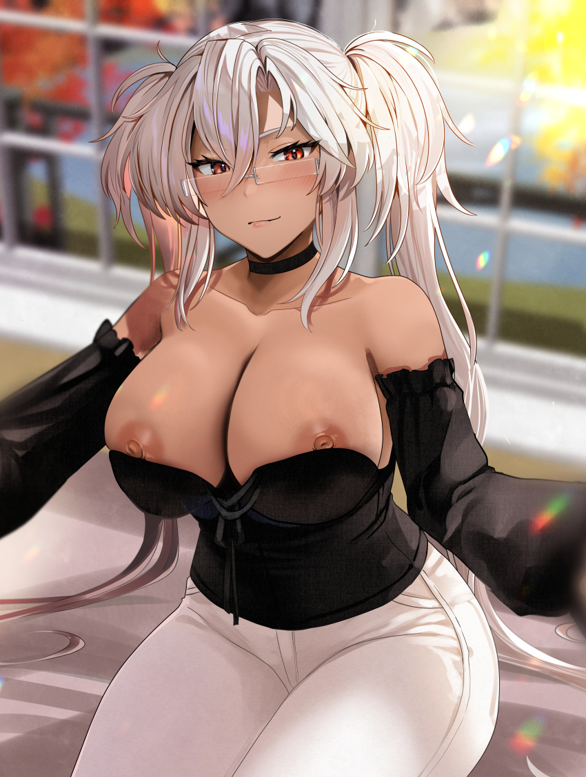 Tags: bare shouldersdark-skinned femalefemaleglassesimageboardkantai collectionlarge breastslooking at viewermusashi (kantai collection)open mouthred eyesRule34sittingsolowhite hairyunamaro