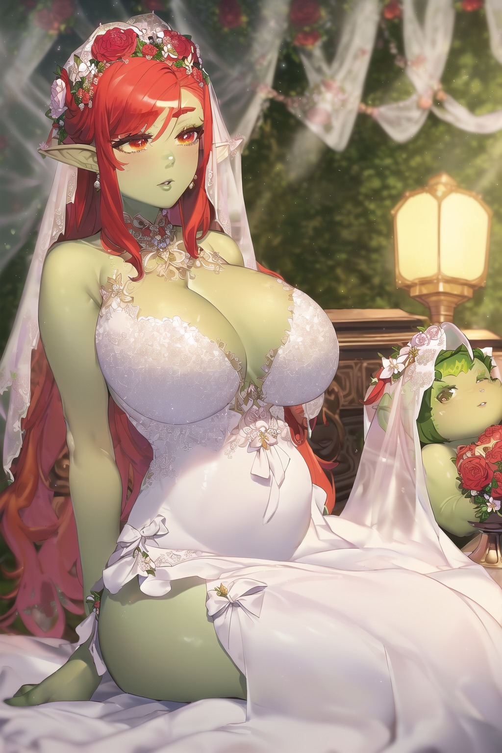Tags: 1girlsai generatedbig breastsbridal veilbridecleavageearly pregnancyearringsfemalefemale focusflower crownflower in hairgreen skinhuge breastsimageboardjewelrylacelong earslong hairmonster girlnai diffusionorange eyesorcorc femalepointy earspregnantred hairRule34sittingsolo focusstable diffusionveilvery long hairwedding dress