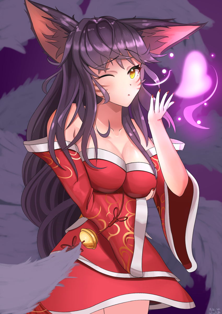 Tags: ahriblack hairblowing kissbreastscleavagedark hairdressfemalefemale onlyfoxfox earsfox girlfox tailheartimageboardkemonomimikissingleague of legendslong hairmagicnine tailed foxpudding300red dressRule34yellow eyes
