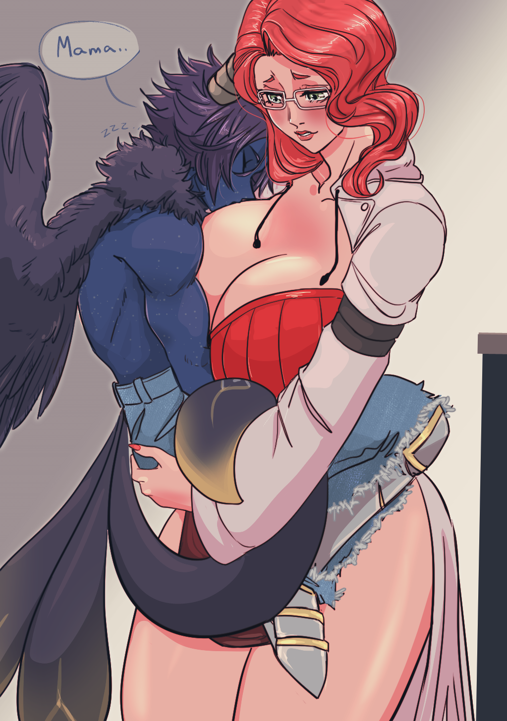 Tags: 1boy1girlsangelangel wingsarmorarmored bootsblue skincaptioncarryingcleavagecommissioncommissioner uploadcradlingdark skindark-skinned maleglasseshi reshornshuge breastshuggingimageboardjeanslabcoatmother and sonnekokat42original characteroriginal characterspurple hairred hairRule34shirtlesssize differenceskirtsleepingsweatertailtears of joywholesome