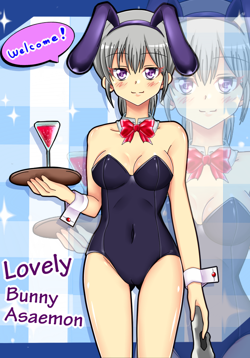 Tags: alternate version availableblushbowtiebunny earsbunny girlbunnysuitcameltoecleavagecowboy shotdetached collarenglish textfemalefemale onlygintamagrey hairikeda asaemonimageboardlooking at viewerneck ribbonpurple eyesRule34shigukoshort hairsmall breastssmilesolospeech bubbletraywrist cuffs