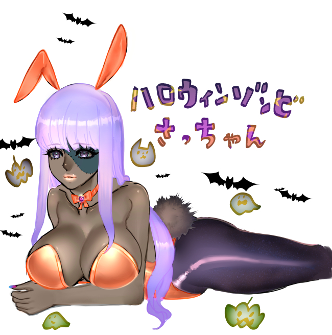 Tags: alternate costumearm under breastsbangsbig breastsblack legwearblunt bangsbunny earsbunny tailbunnysuitchokercleavagedark skindark-skinned femalefacial scarfemalefemale onlygintamaglasses removedhalloweenhalloween costumeimageboardjapanese textlavender hairlong hairmarupomonster girlneck ribbonon stomachpantyhosepurple eyespurple hairribbon chokerRule34sarutobi ayamesolozombie girl