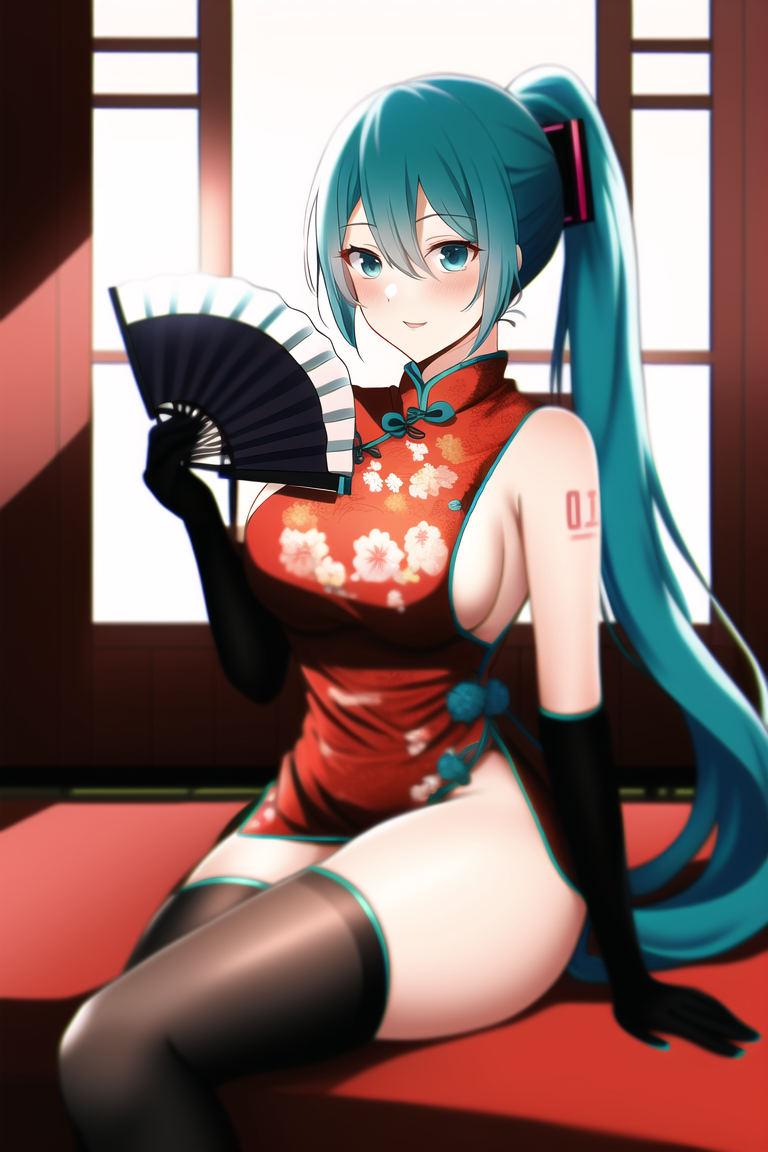 Tags: ai generatedblack gloveschinese clothesfanhatsune mikuimageboardlong glovesnai diffusionponytailqipaoRule34seductivesideboobstable diffusionthick thighsthighhighsvocaloid