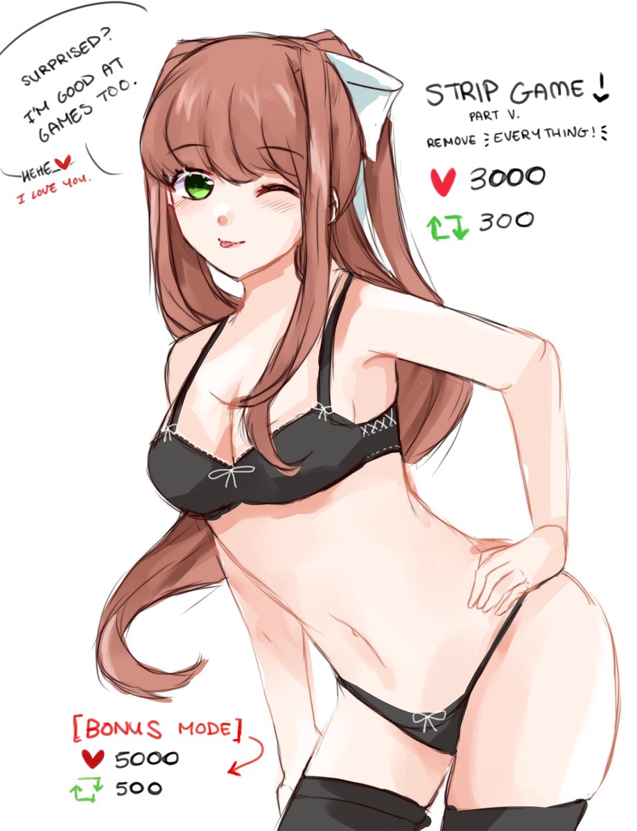 Tags: arrow (symbol)black brablack pantiesblepbow brabow pantiesbracleavagedoki doki literature clubenglish texteye closedfemalegreen eyesheartheart iconimageboardlong hairmatching underwearmonika (doki doki literature club)navelone eye closedpantiesretweet iconRule34strip gametextunderwear onlywhite backgroundyuxine