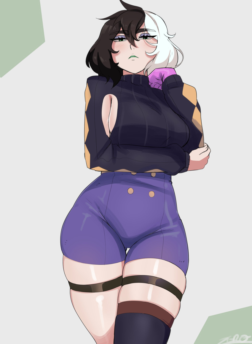 Tags: 1girlsarm under breastsblack hairborrowed characterclothingeyeshadowfemalefemale onlygreen eyesgreen lipstickhi resimageboardlegbandlegs togetherlegwearlight blushlooking at viewermedium hairnarrowed eyesone gloveRule34sideboobsingle thighhighsolosolo femalestandingthick thighsthigh gapthigh squishtwo tone hairunamusedwhite hairyorra villeneuvezeromomentai