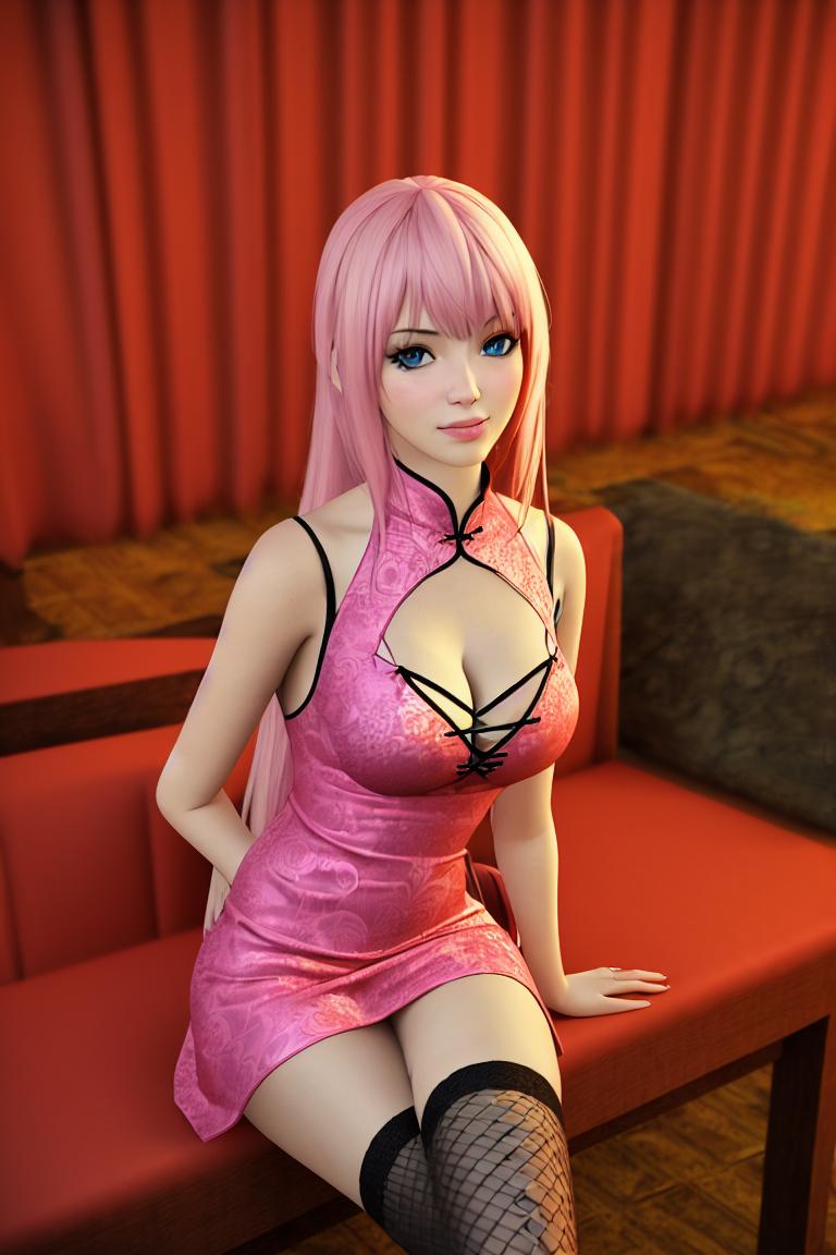 Tags: 3dai generatedblue eyesbreastschina dresschinese clothescleavagecleavage cutoutclothing cutoutdressfemalefishnet legwearimageboardindoorslipslooking at viewermedium breastsmegurine lukapink dresspink hairrealisticred curtainsRule34sittingsolostable diffusionthighhighsvery long hairvocaloid