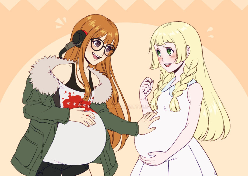 Tags: 2girlsbig bellyblonde hairblushclothedclothed femaleclothingexcitedfemalefemale onlyfully clothedgingerglassesgreen eyeshand on own stomachheadphonesimageboardlillie (pokemon)long hairlooking at each othermisscherrylleopen mouthorange hairpersonapersona 5pokemonpokemon smpregnantpregnant bellyready to popRule34sakura futabashysimple backgroundsmall breastsstandingwholesome