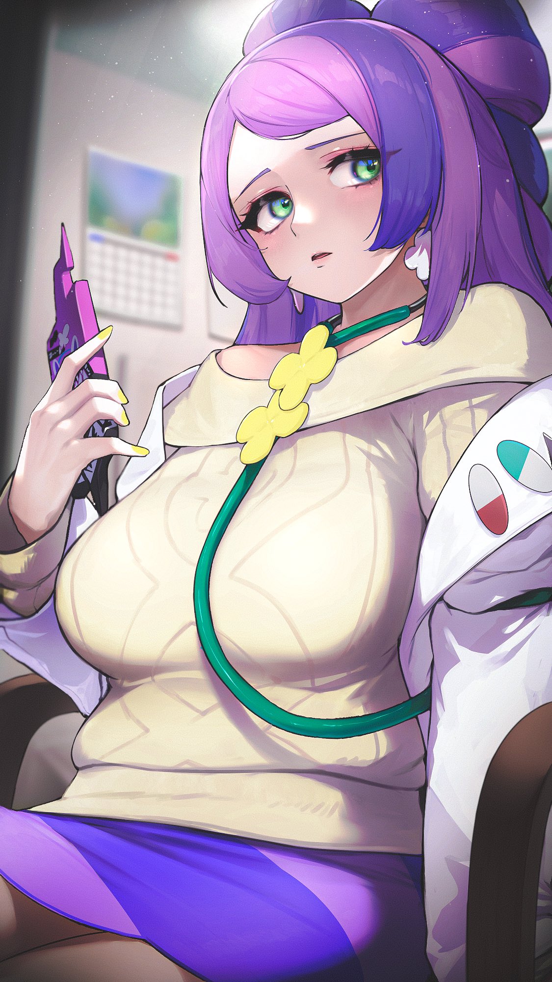 Tags: 1girlsbreastsclothedearringsfemalefemale onlygreen eyeshizakeholding objecthuge breastshumanhuman onlyimageboardlight skinlight-skinned femalelong hairmiriam (pokemon)nail polishnintendonursepink hairpokemonpokemon svpurple hairrotom phoneRule34solosolo femalethick thighsyellow nails