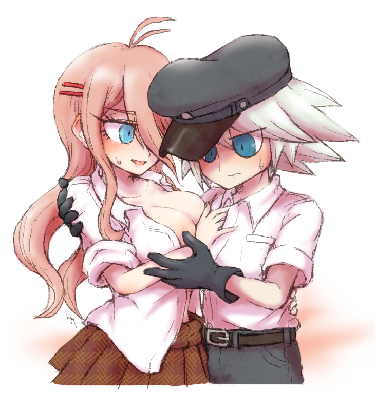Tags: 1boy1girlsahogebeltblonde hairblue eyesblushbreast presscleavagedanganronpadanganronpa v3embarrassedfemaleglovesh9 sthaircliphatholdingimageboardiruma miujeanskiibolooking at anothermalenaughty facenew danganronpa v3no braopen shirtRule34simple backgroundskirtsweatsweatdropwhite hair