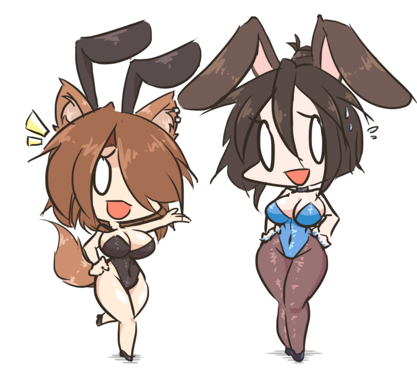 Tags: 2girlsanimal earsanimal tailbangsblack hairbreastsbrown hairchibicleavageclotheddog earsfake rabbit earsfemalefemale onlyhair over one eyeimageboardlarge breastsleotardnail polishoriginaloriginal characterplayboy bunnyrabbit earsRule34short hairstrapless leotardsuggestiveyukihind