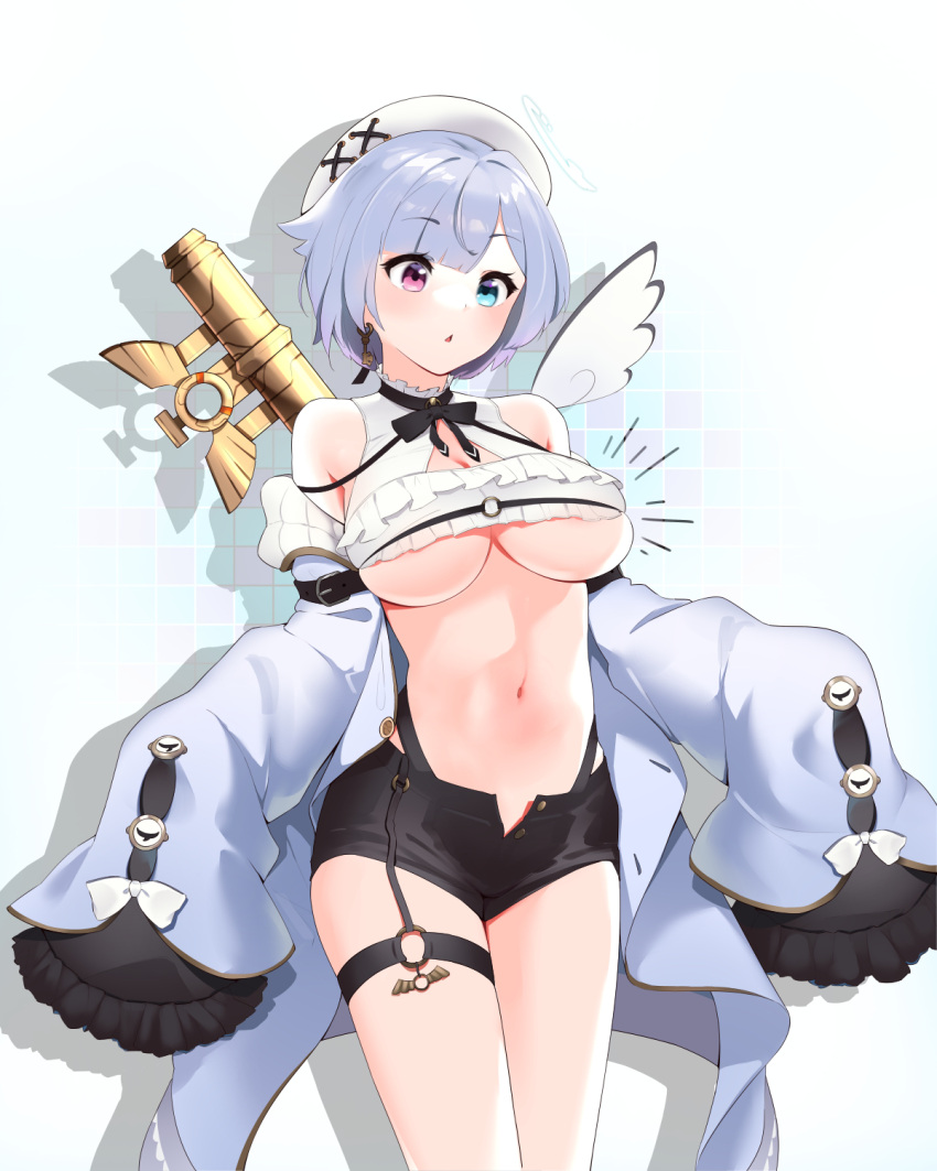 Tags: 1girlsalternate breast sizeamemiya nazunaangelangel wingsartist requestbangsbellberetblue eyesbowbreastsgarter strapshatheterochromiahighresimageboardkeylacelong sleevesmedium breastsnaveloversized clothespink hairpuffy sleevespurple hairRule34shockedshort hairshortssimple backgroundsolostandingthigh gapthighsunderboobvirtual youtubervshojowhite backgroundwings