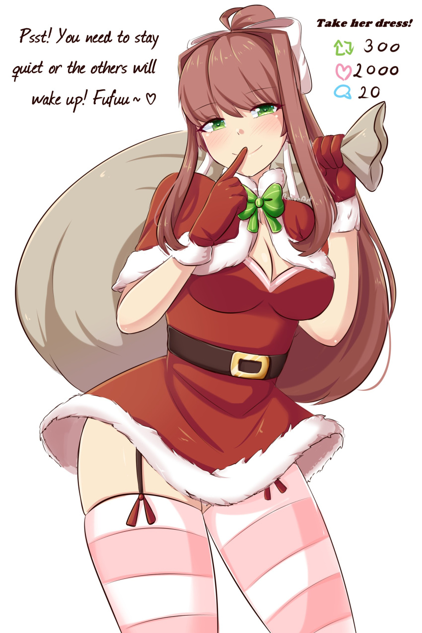Tags: 1girlsartist namebeltblushbowbrown hairchristmascleavagedialoguedoki doki literature clubfemalefemale onlyglovesgreen eyeshair ornamenthair ribbonimageboardlight brown hairlong hairlooking at viewermonika (doki doki literature club)plain backgroundraionartRule34sacksanta costumesolostockingsstrip gamethick thighsthighhighswatermark
