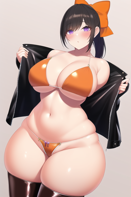 Tags: ai generatedblack hairblack jacketblushbowbrown bootscurvaceouscurvyhairbowhighresimageboardlarge breastslatexleather bootsleather jacketnai diffusionnarrow waistopen jacketorange bikiniorange boworiginaloriginal characterponytailpurple eyesrubycksRule34shiny clothesshiny skinstable diffusionthick thighstight clothingwhite backgroundwide hips