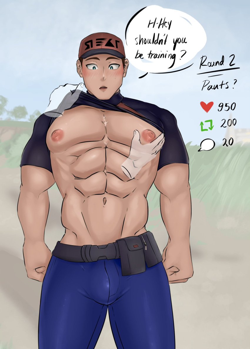 Tags: bulgecourier (pokemon)dialogueembarrassedenglish textimageboardmalemale onlymusclesmuscularmuscular malenipple playnipple tweakoutdoorsoutsidepokemonpokemon svRule34shirt liftshystrip gameyoruunsfw
