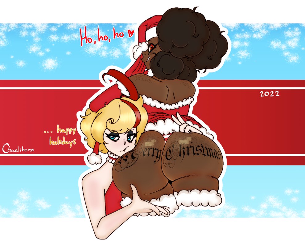 Tags: 20222girlsbig assbig buttblack hairblonde hairblue eyescharlihorsschristmaschristmas clothingchristmas outfitdark-skinned femaleenglish texthatheartimageboardlooking at viewerlooking backlooking back at viewerpantiesrear viewred and white pantiesred eyesRule34santa hatsmilestriped pantiestattootattoo on butttextthick thighs