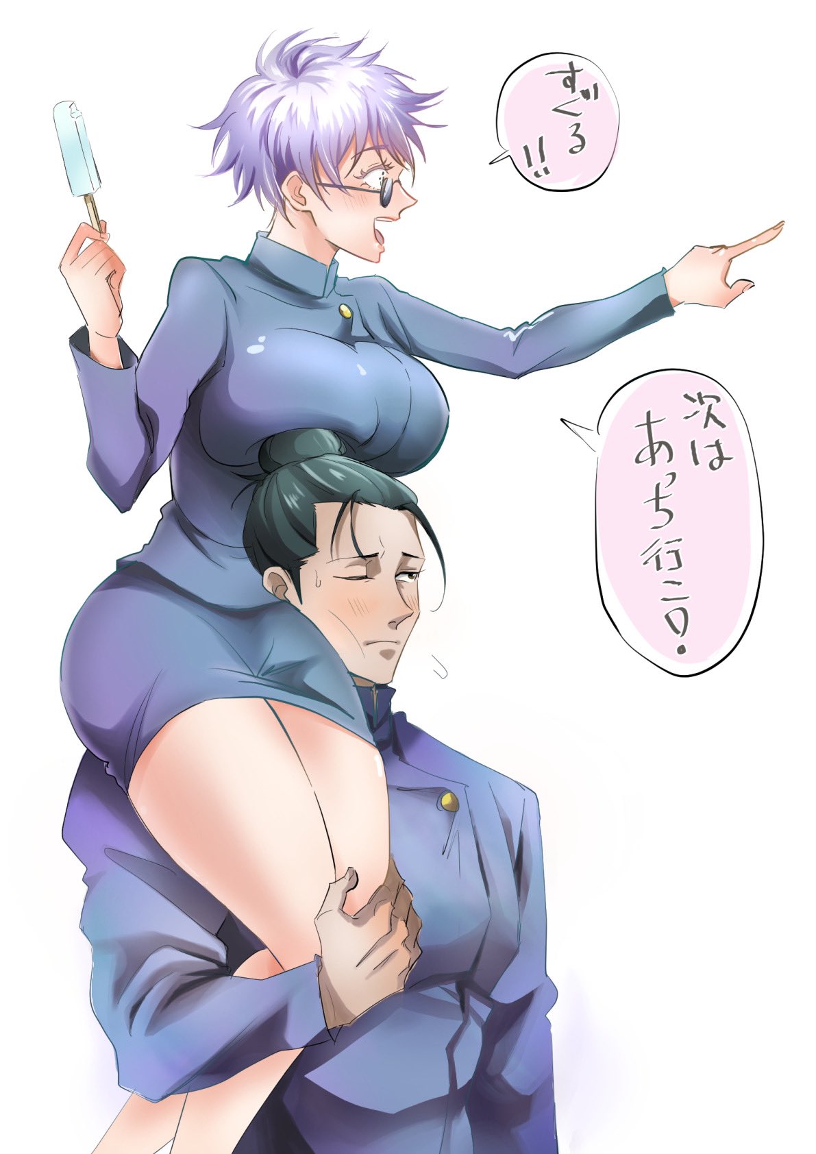 Tags: 1boy1girlblushbreast restbreastsbreasts on headbuffcoupledatedokudamisou109femalefoodgenderswap (mtf)glasseshighresholdingholding legholding personice creamimageboardjapanese textjujutsu kaisenlarge breastslight purple hairlong hair malemuscularmuscular maleopen mouthrule 63Rule34satoru gojoshort hairspeech bubblesuguru getovery short hair