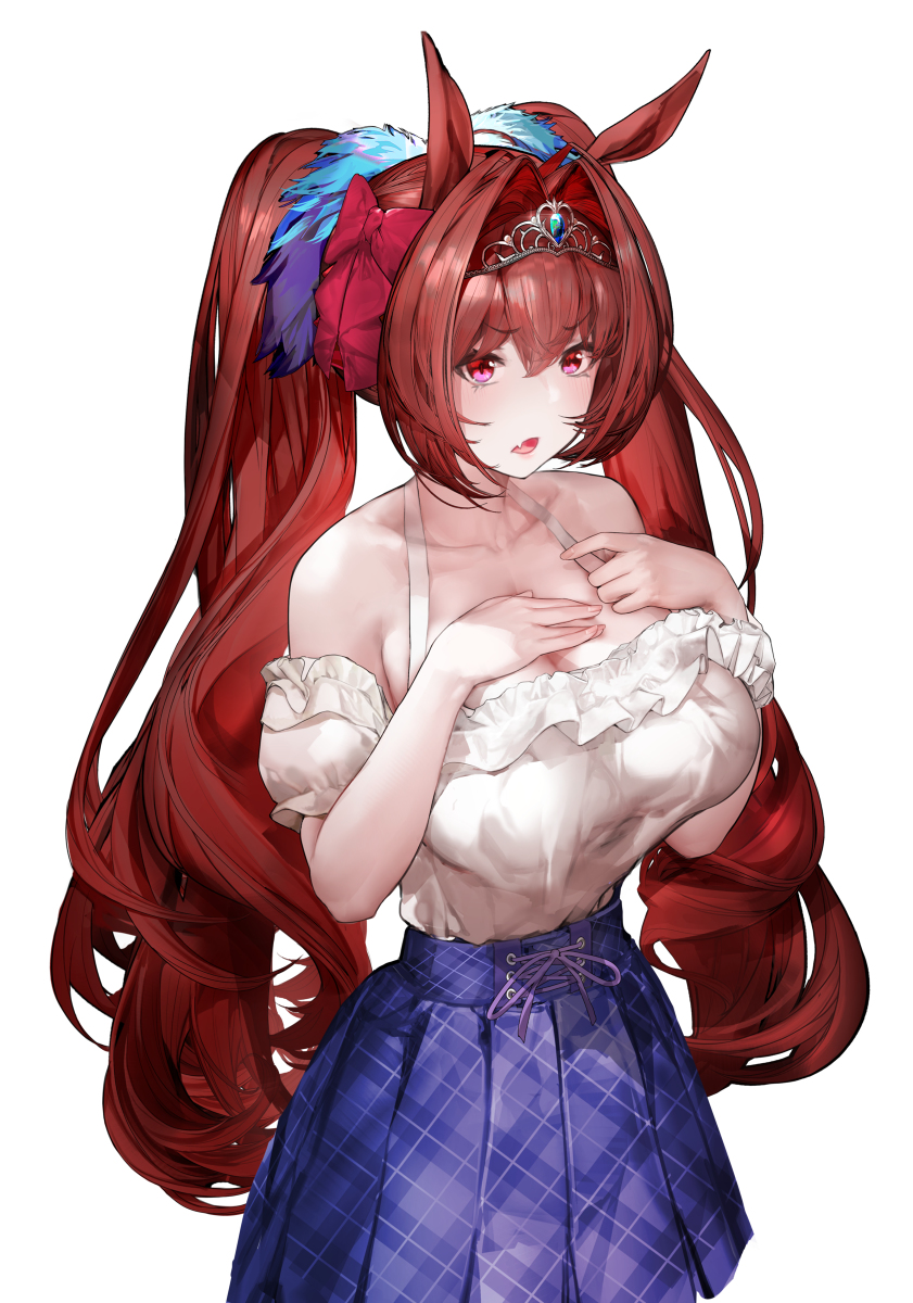Tags: 1girlsblue skirtcleavagefemale focusfemale onlyhand on chesthorse earshorse girlimageboardred eyesred hairRule34skirtumamusumevery long hairxlxiaoluodiaofa
