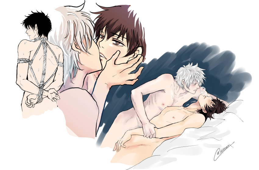 Tags: 2boysarm grabarms behind backbondageboundbound wristsbreathbrown haircompletely nudedark hairgintamagintoki sakatahand on another's facehead thrown backhead tilthijikata toshirohinowaximageboardimplied sexkissinglight-skinned malemalemale onlymultiple scenesnudeon backon bedpale-skinned maleroperope bondageRule34silver hairsweatyaoi