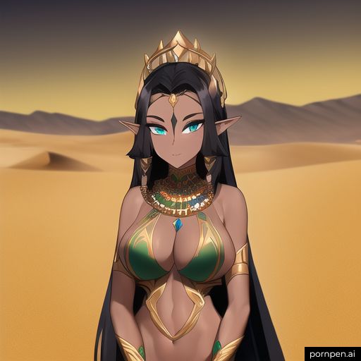 Tags: ai generatedblack hairdark skindesertelfelf femalefemale elfgreen eyesimageboardjewelrylong hairlooking at viewerpornpen.airevealing clothesRule34tribal
