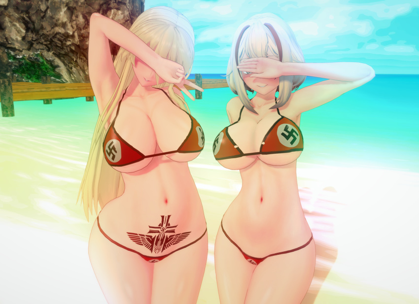 Tags: 2girlsazur lanebikinibismarck (azur lane)bleachedartoriablonde femaleblonde hairblue eyesbrown eyesfemale onlyhidden eyesimageboardkoikatsularge breastsnaziroon (azur lane)Rule34swastikaswastika bikinitattoo