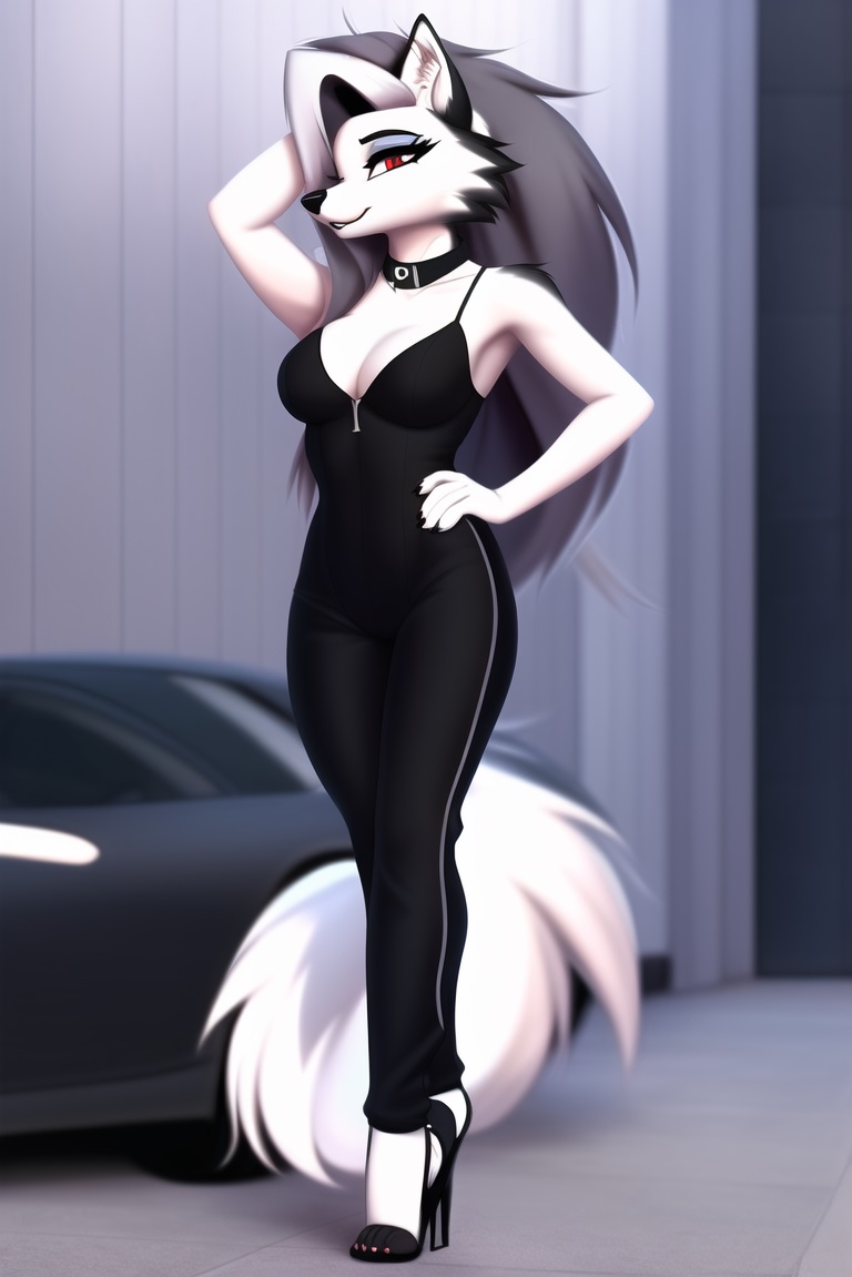 Tags: 1girlsai generatedanthrocanid demoncaninedemonfurryfurry femalegrey hairhardboildchickenheelshellhoundhelluva bosshigh heelsimageboardlong hairloona (helluva boss)red eyesRule34wolf earswolf girlwolf tail