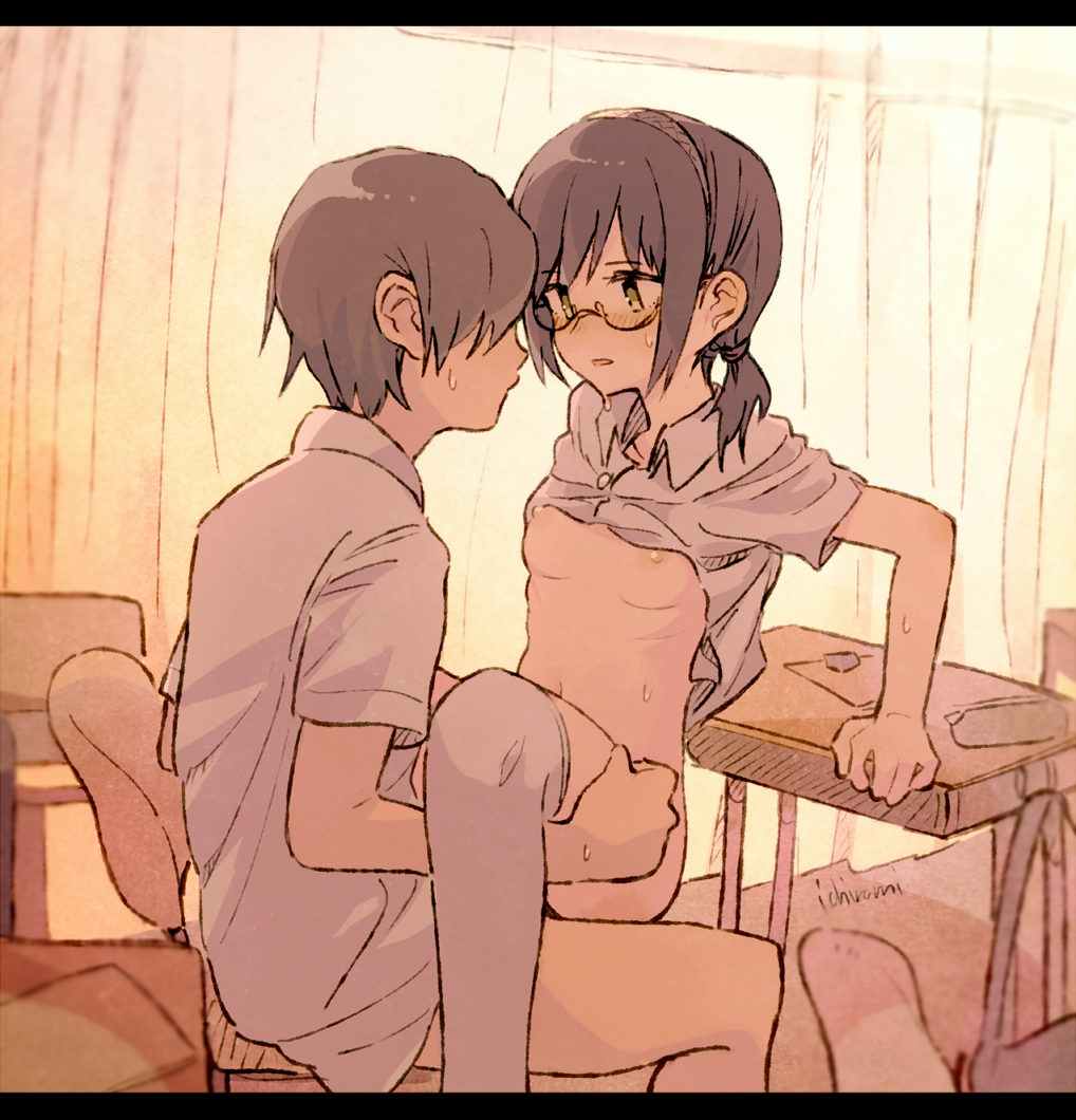 Tags: 1boyblushbottomlessbreastsbrown hairchairclassroomclothes liftcollared shirtcommentarycurtainsdeskfemalegreen eyeshairbandichiromiimageboardindoorslooking at anothermalemedium hairoriginalparted lipsRule34school chairschool desksexshirtshirt liftsittingsmall breastsstraddlingstraightsweatthighhighstwintailsupright straddleyoung