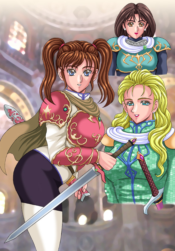 Tags: 3girlsarmorbeltblonde hairblue eyesbracerbreastplatebrown eyesbrown haircapeearringsfemale onlyhair tiesholding objectholding weaponimageboardleaning forwardlipsticklooking over shoulderoriginalpixivRule34scabbardshirtshortsshoulder armorsilegysmilestandingstockingsswordswordsweaponyoshizawa yuuri