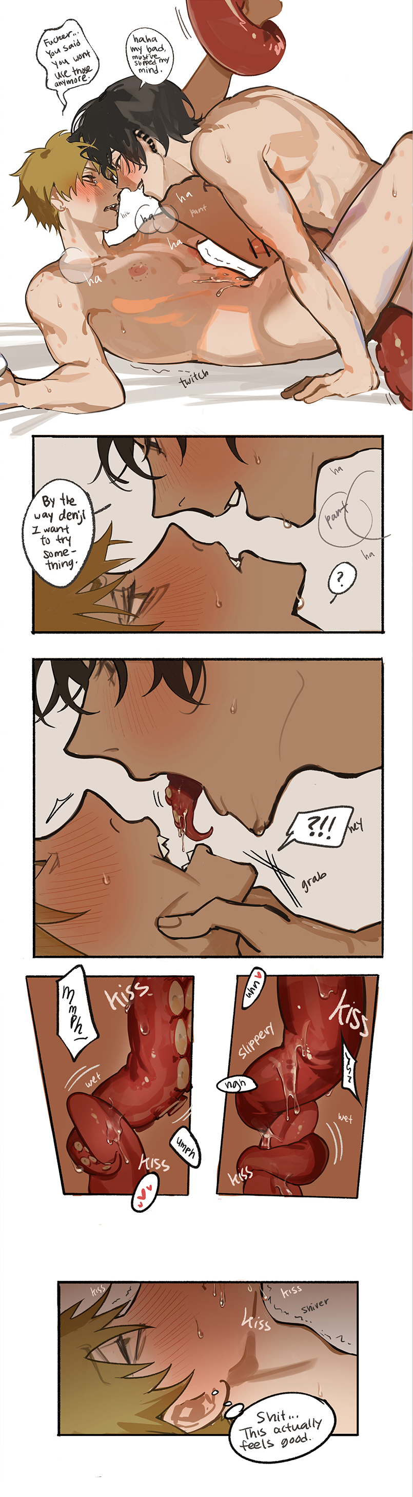 Tags: 2boysblack hairblonde hairblushchainsaw mandenji (chainsaw man)english textgajyagogayhirofumi yoshidaimageboardkissingRule34tentacletentacle in mouthtentacle on maletentacle sexyaoi