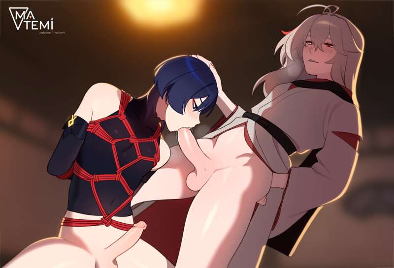 Tags: arms behind backblowjobblue eyesblue hairbondageeyelinerforced oralgaygenshin impacthair downhand on asshand on butthand on hiphands behind headimageboardkaedehara kazuhamale onlymatemipartially clothedpartially nudered eyesred hairred highlightsRule34scaramouche (genshin impact)skin tightsmilestern expressionwhite hairyaoi
