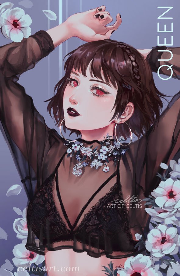 Tags: arms upblack brablack nail polishblack nailsbrabrown hairceltisartearringsflowerflowershairbandimageboardlingerielipstickmakoto niijimanail polishpersonapersona 5petalsred eyesRule34seductivesee-throughsee-through clothingshort hairslight blushslight smile
