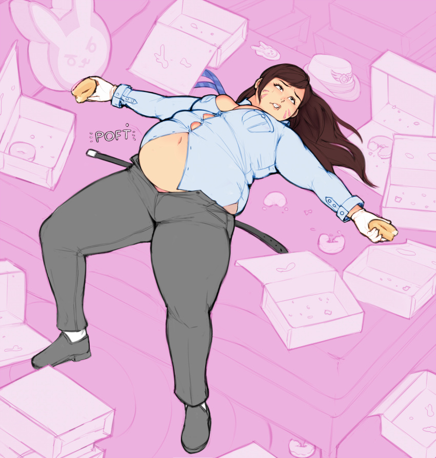 Tags: big bellybig breastsbrown eyesbrown hairbursting clothesbutton down shirtchubbychubby femalecurvyd.vaimageboardlaying downlaying on bedoverwatchoverweightRule34tight clothing